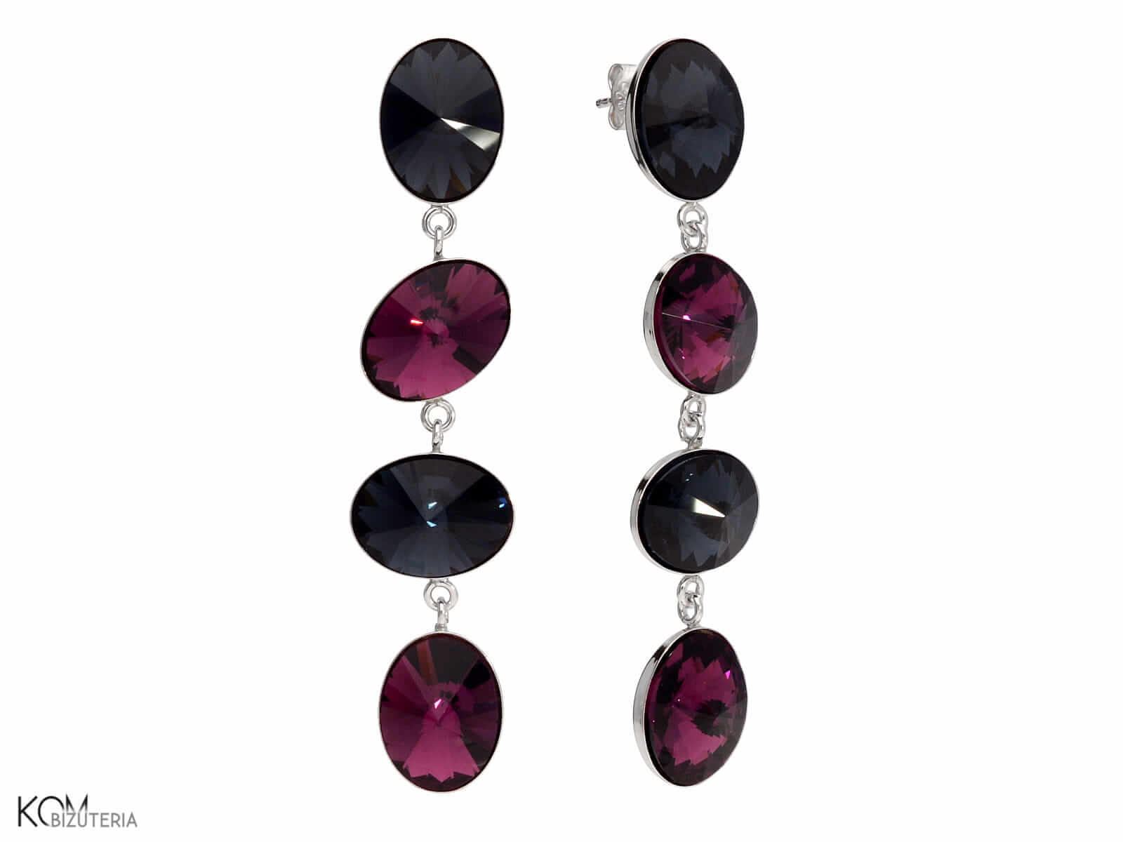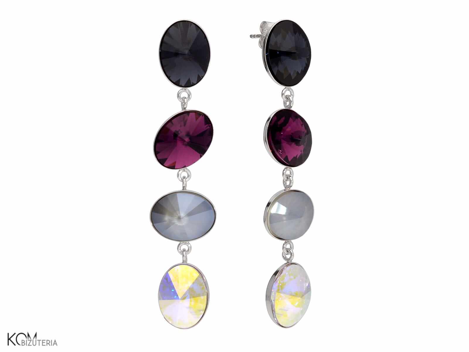 Długie wiszące kolczyki sztyfty ozdobione owalnymi kryształami Swarovski. Każdy kolczyk ma cztery kryształy, w dopasowanych, modnych kompozycjach kolorystycznych.