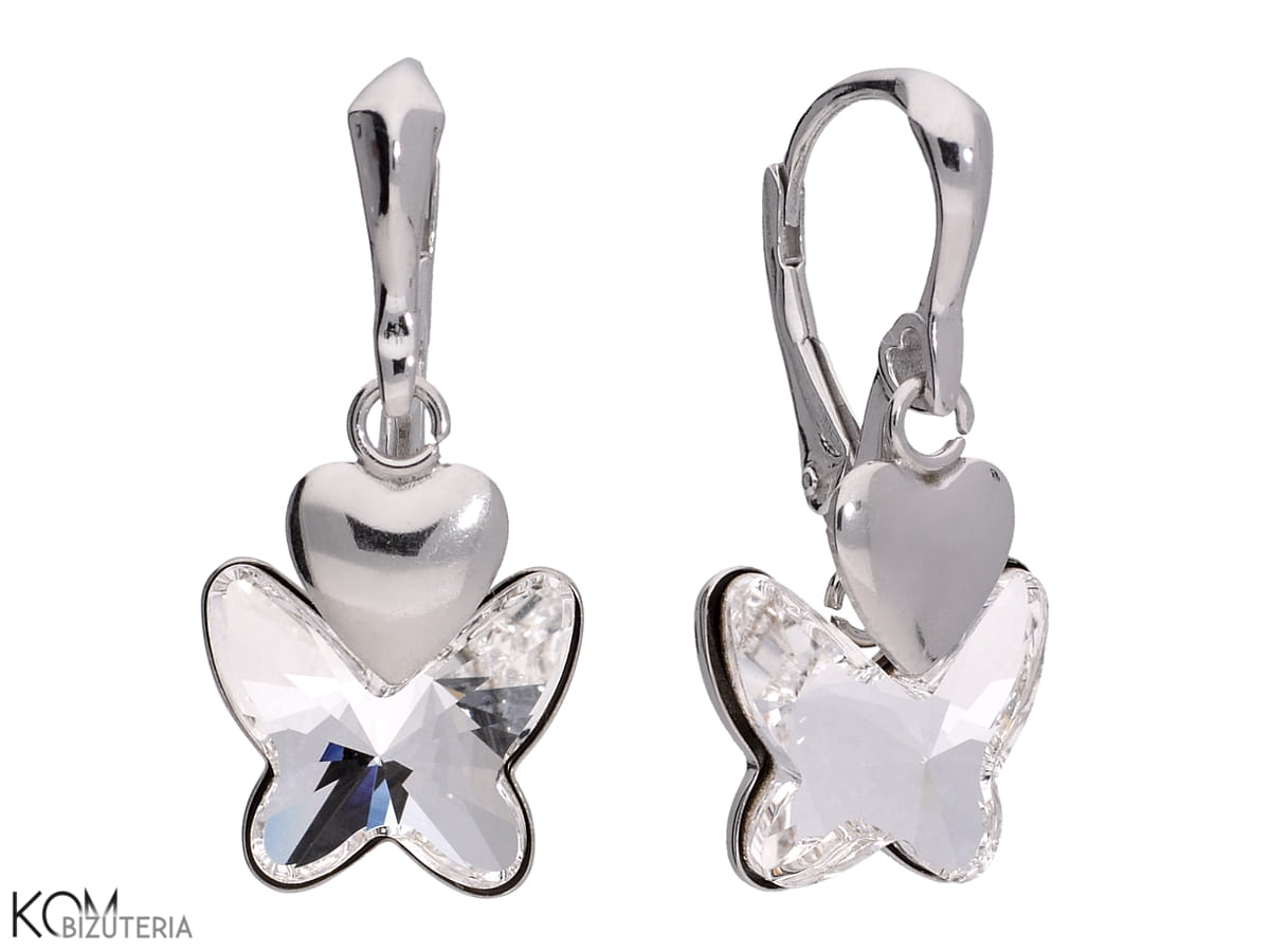 Srebrne kolczyki z wiszącymi srebrnymi charmsami - zawieszkami serduszkami i kryształami Swarovski® - kryształowymi, białymi motylami. Dzięki nowoczesnemu zapięciu kryształy te nachodzą się na siebie, tworząc interesującą kompozycję.