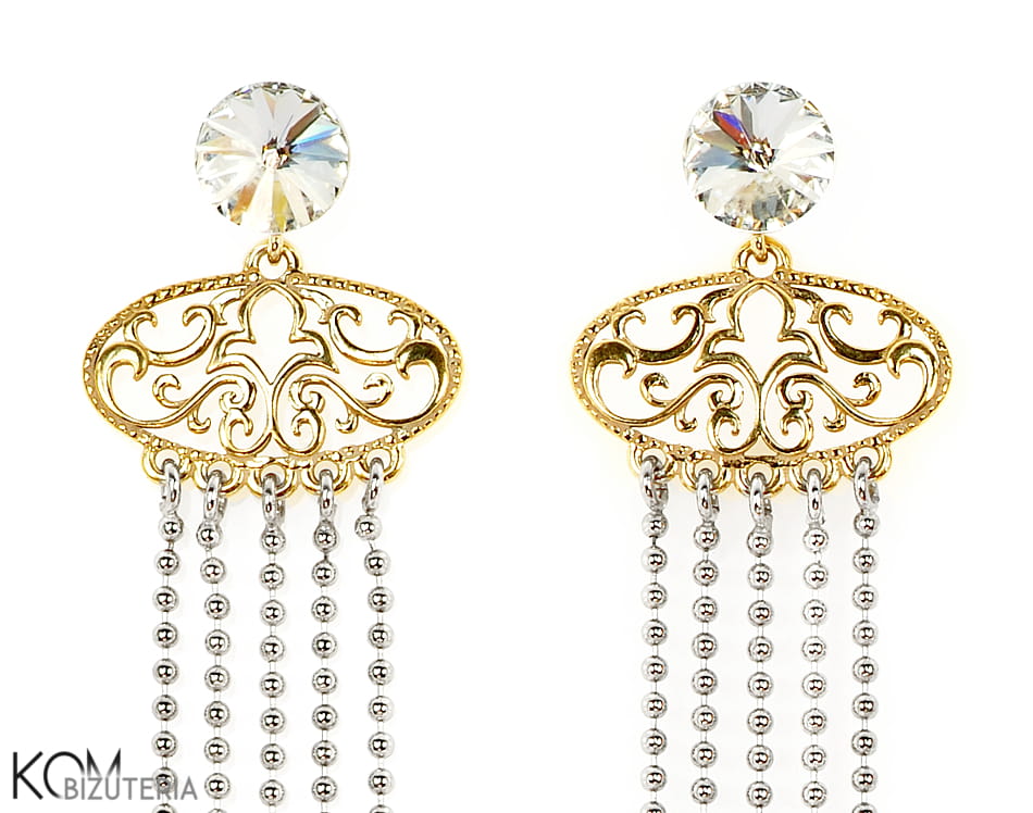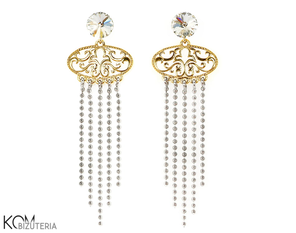 Ozdobne, długie, wiszące kolczyki sztyfty glamour z elementami pozłacanego srebra i srebra rodowanego zwieńczone mieniącymi się kryształkami Swarovski® rivoli.