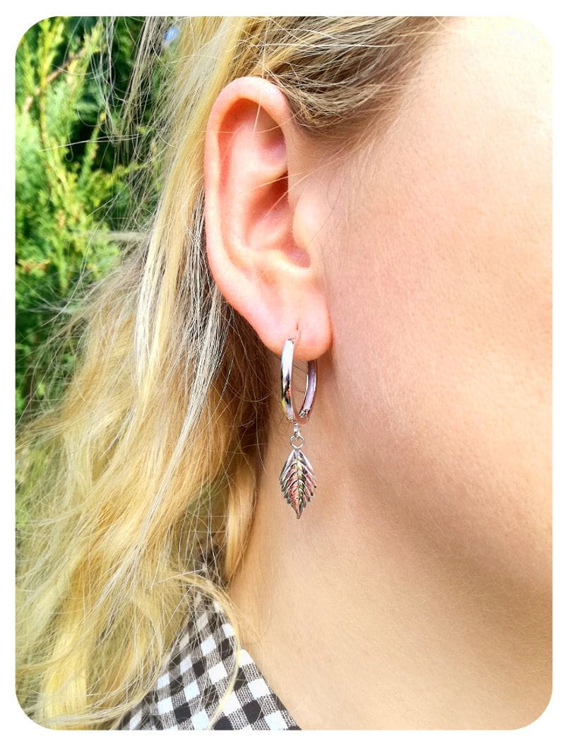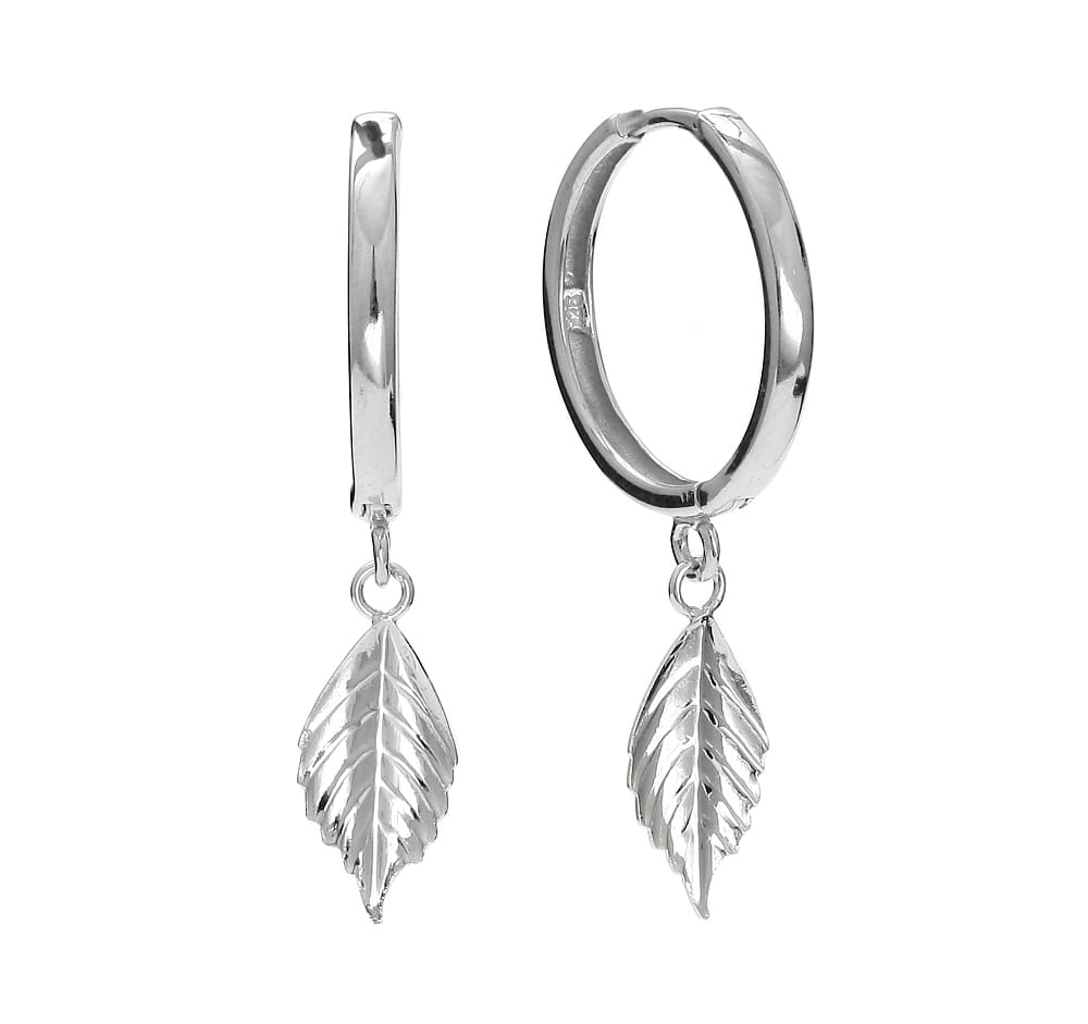 Srebrne, duże wiszące kolczyki koła ozdobione zawieszką w kształcie listka.