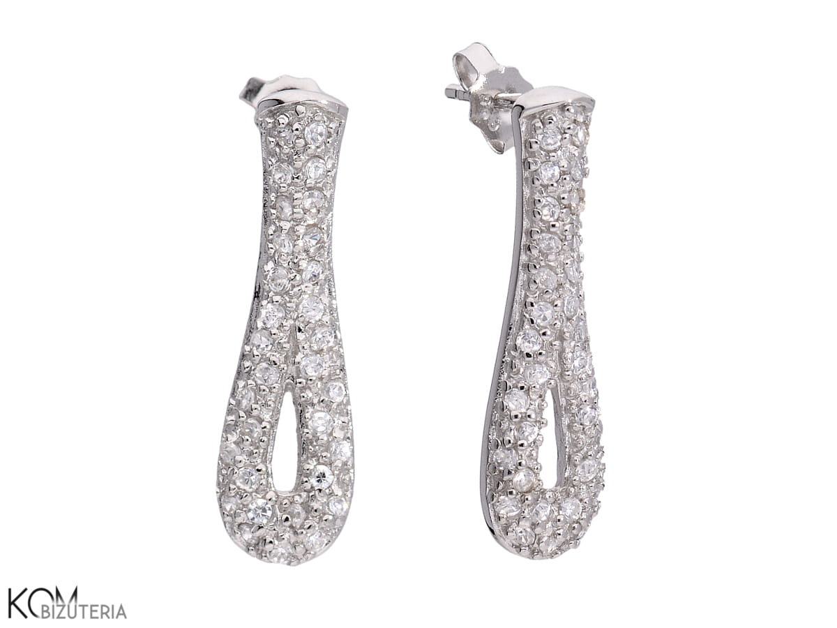 Śliczne srebrne kolczyki sztyfty w kształcie pojedynczych łezek - wstążek wysadzanych cyrkoniami.