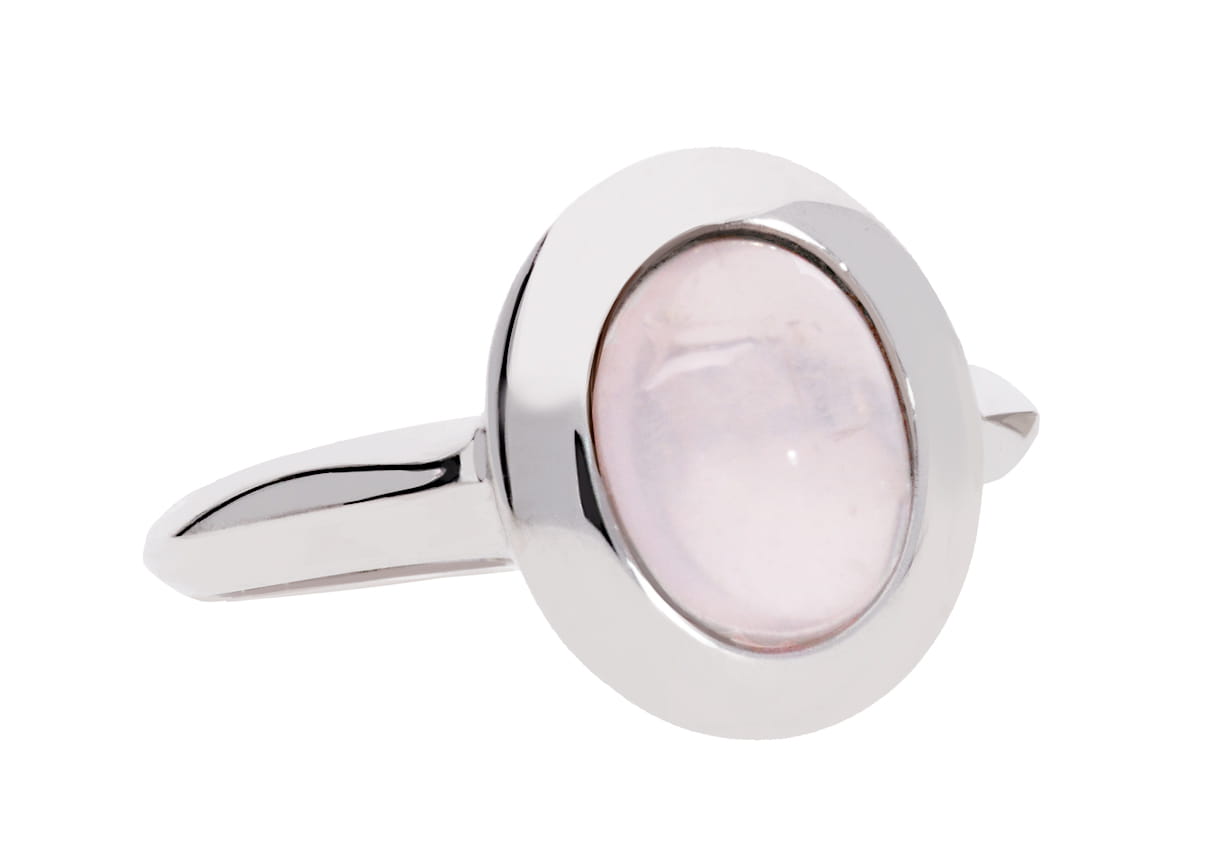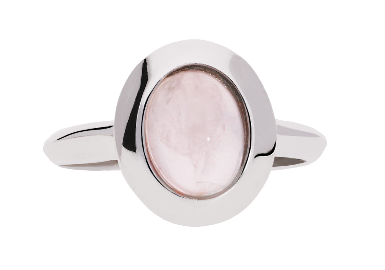 Srebrny pierścionek z naturalnym różowym kwarcem (inaczej zwanym różeninem) w kształcie owalu i kolorze delikatnego różu.