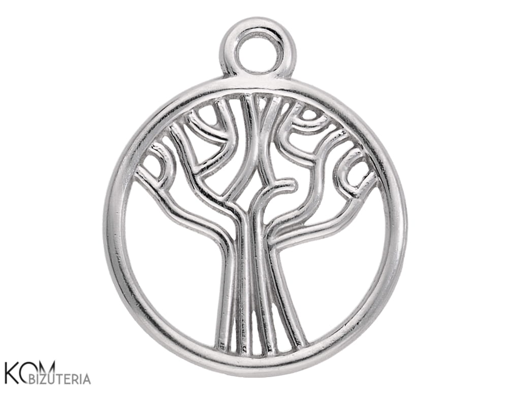 Srebrna, rodowana zawieszka charm w kształcie graficznie przedstawionego drzewa, otoczonego srebrnym, okrągłym pierścieniem. Może przywodzić na myśl drzewo Yggdrasil - drzewo życia z mitologii nordyckiej (mitologii wikongów). Wykonana z litego srebra wysokiej jakości.
