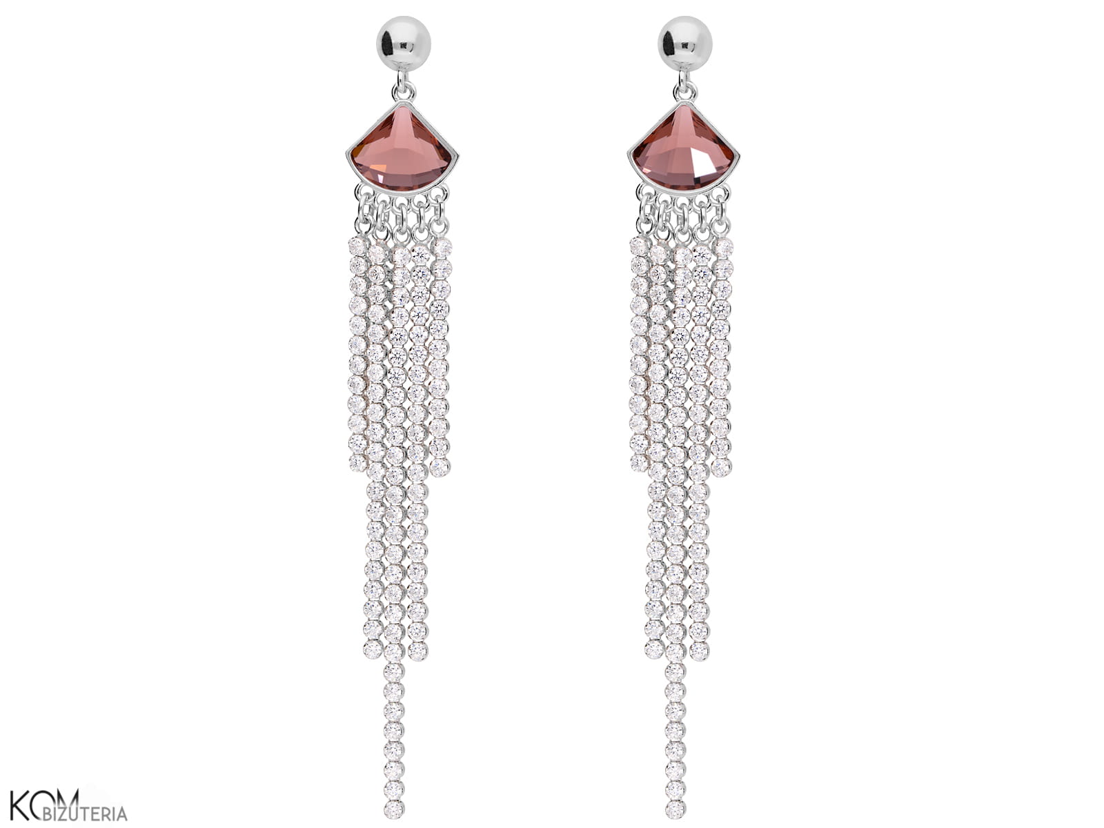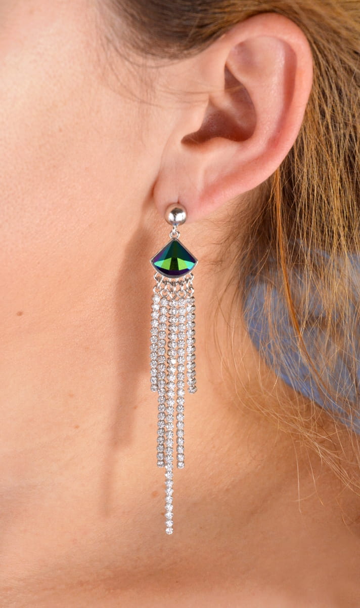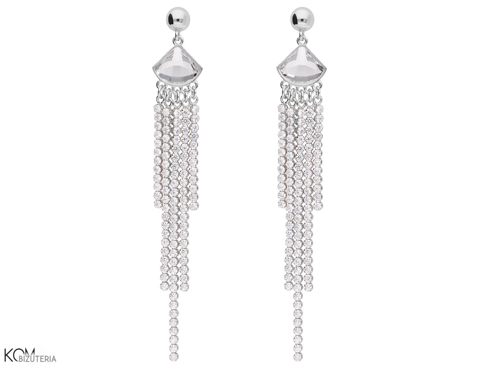 Długie kolczyki sztyfty VOILE z wiszącymi niczym girlandy łańcuchami pięknych, jasnych białych cyrkonii. Kolczyki te zaakcentowane są kryształem w kształcie wachlarza w trzech różnych kolorach do wyboru: