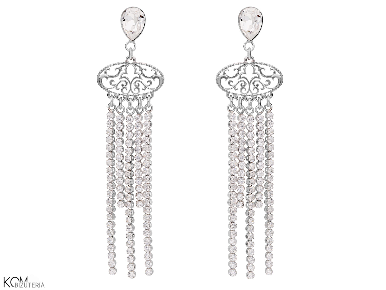 Długie kolczyki sztyfty VOILE z wiszącymi niczym girlandy łańcuchami pięknych, jasnych białych cyrkonii. Kolczyki te zaakcentowane są kryształem w kształcie łezki w kolorze białego niczym świeży śnieg kryształu.